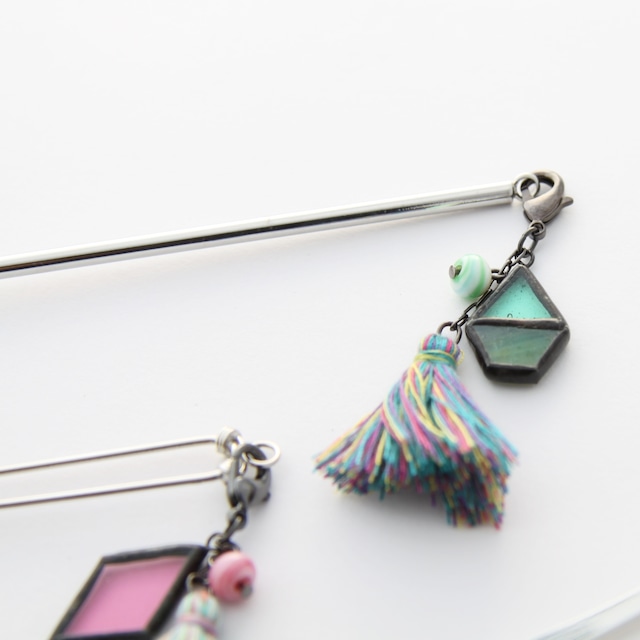 ステンドグラスのかけらに、小さなとんぼ玉とタッセルを合わせてチャームにしました。 手帳やポーチを個性的に彩ります。 ◆ 必ず色と金具オプションをお選びください ◆ タッセルの色ごとにグループ分けしてあります。 お好みのタッセルカラーからお選びください。 グループ内のどれが当たるかはお楽しみ! 今回の出品は2~4枚目の写真です。 お好きなところに付けてお使いいただけます。 オプション金具を選択された場合は、カニカンで取り付ける形でお送りします。 ─┤商品詳細├───── ・素材 金具(真鍮メッキ・ステンレス他)・ガラス・ハンダ・カパーテープ・銅線・ポリエステル ・サイズ 長さ(カニカンを含む)約6cm/ステンドグラス約2cm/幅 約1.5cm ────────────