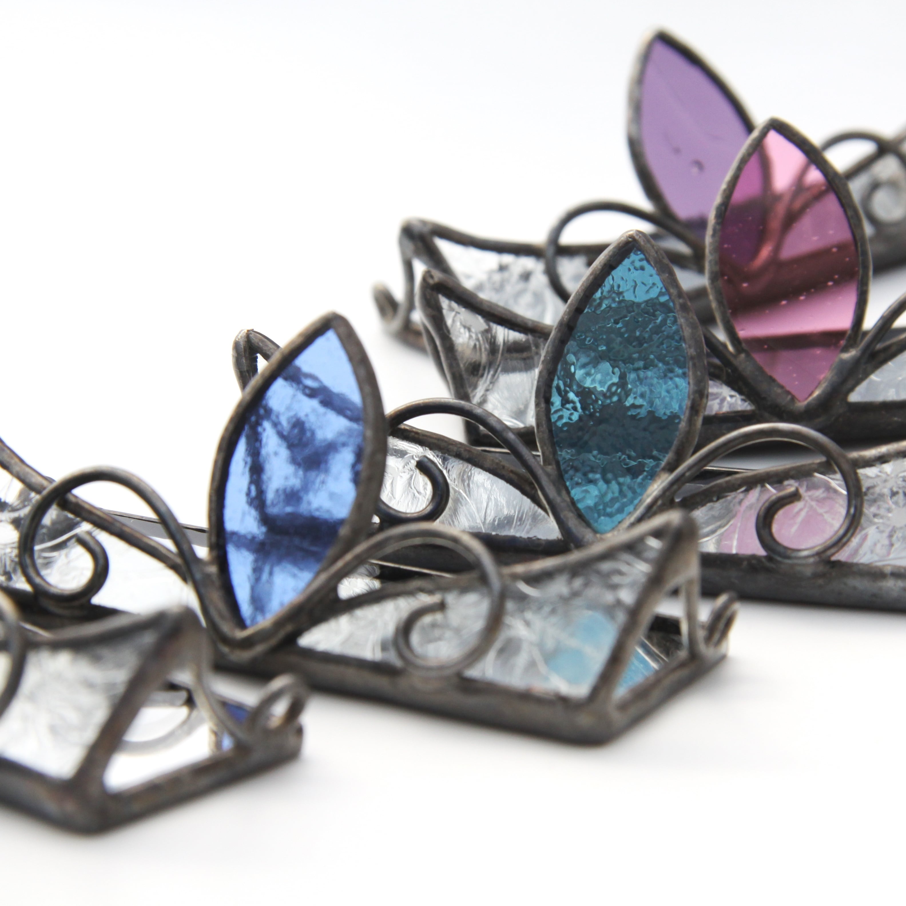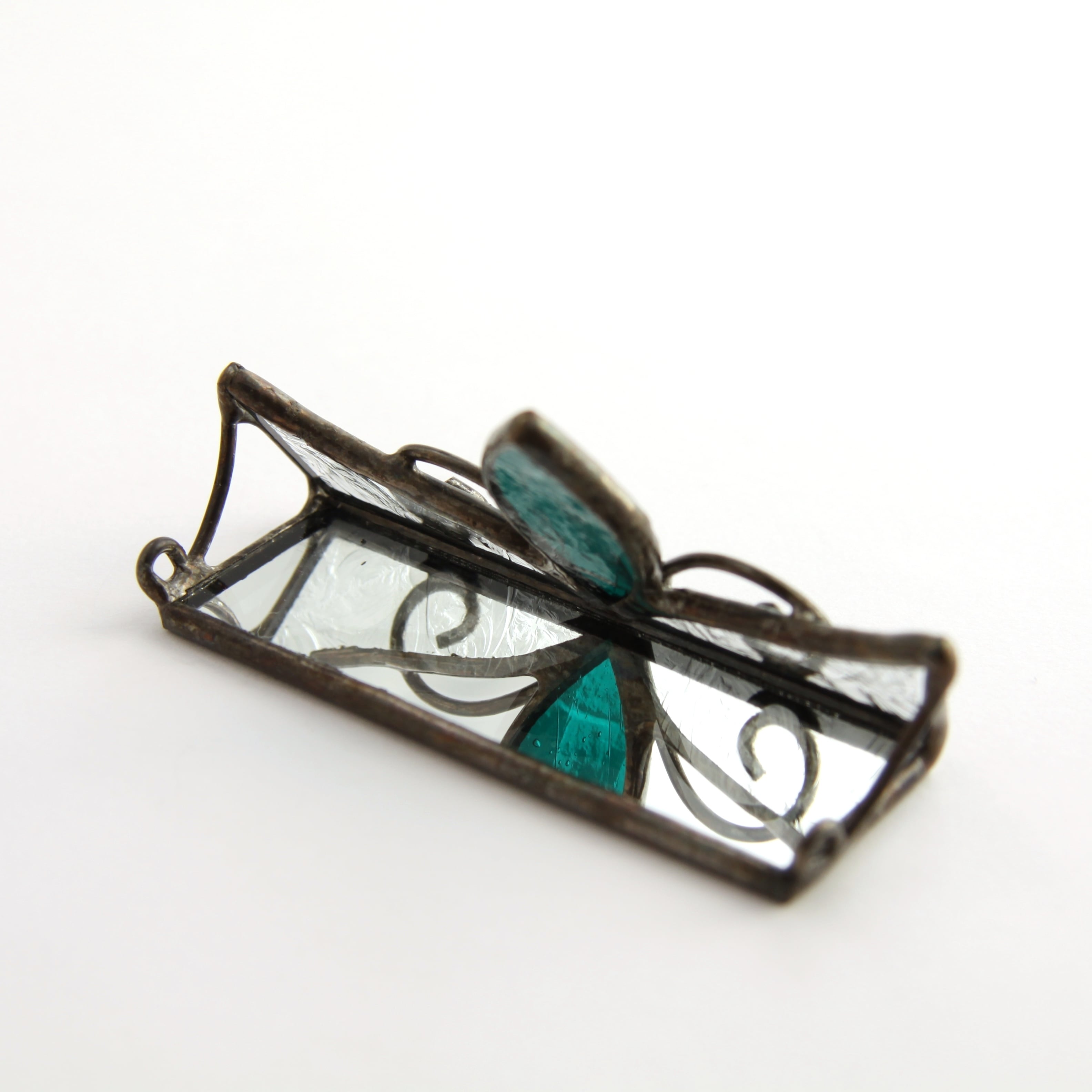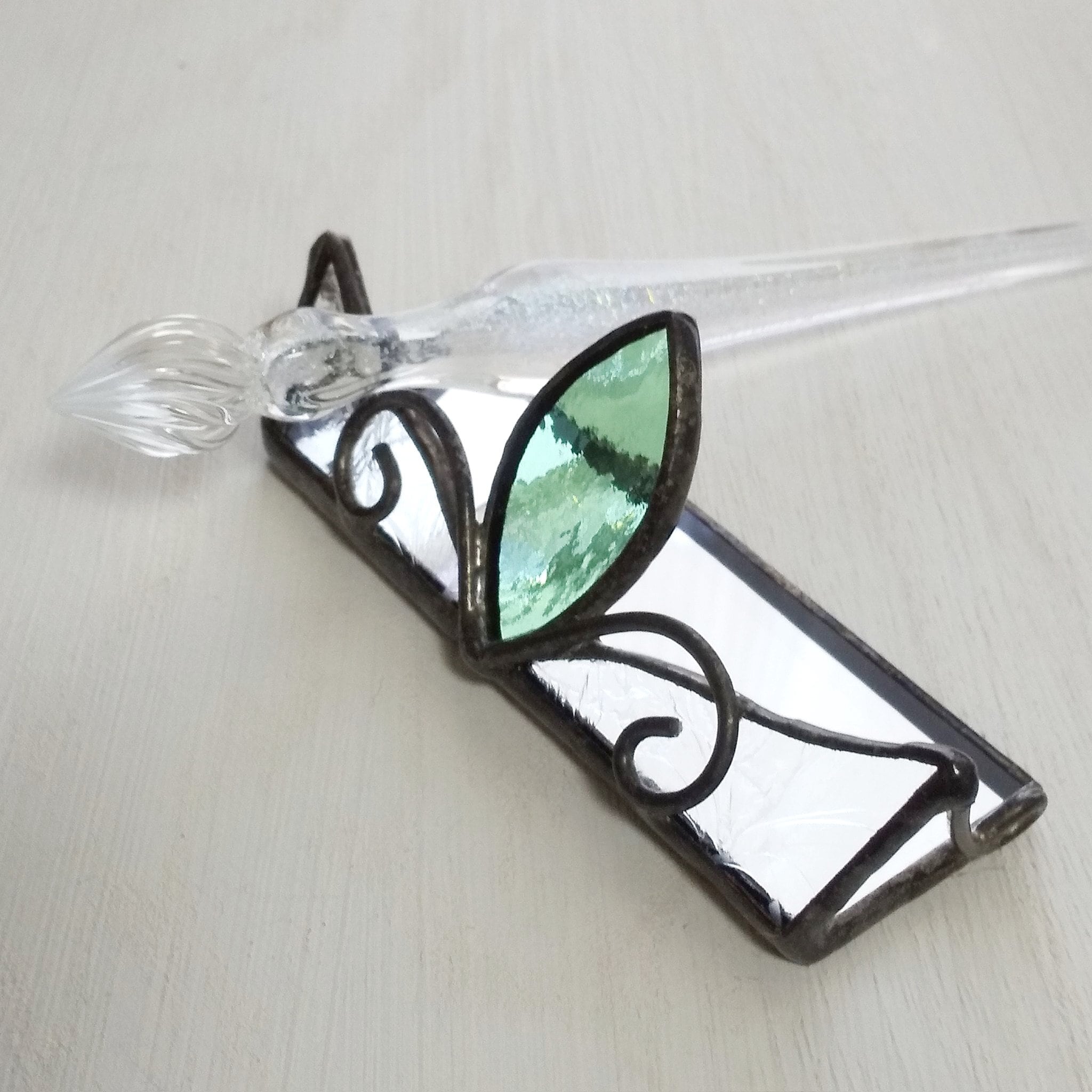 濃いめのビリジャングリーンのガラスを中心に、霜のような模様のグルーチップガラスと組み合わせ、サークレットを模したペンレストを作りました。