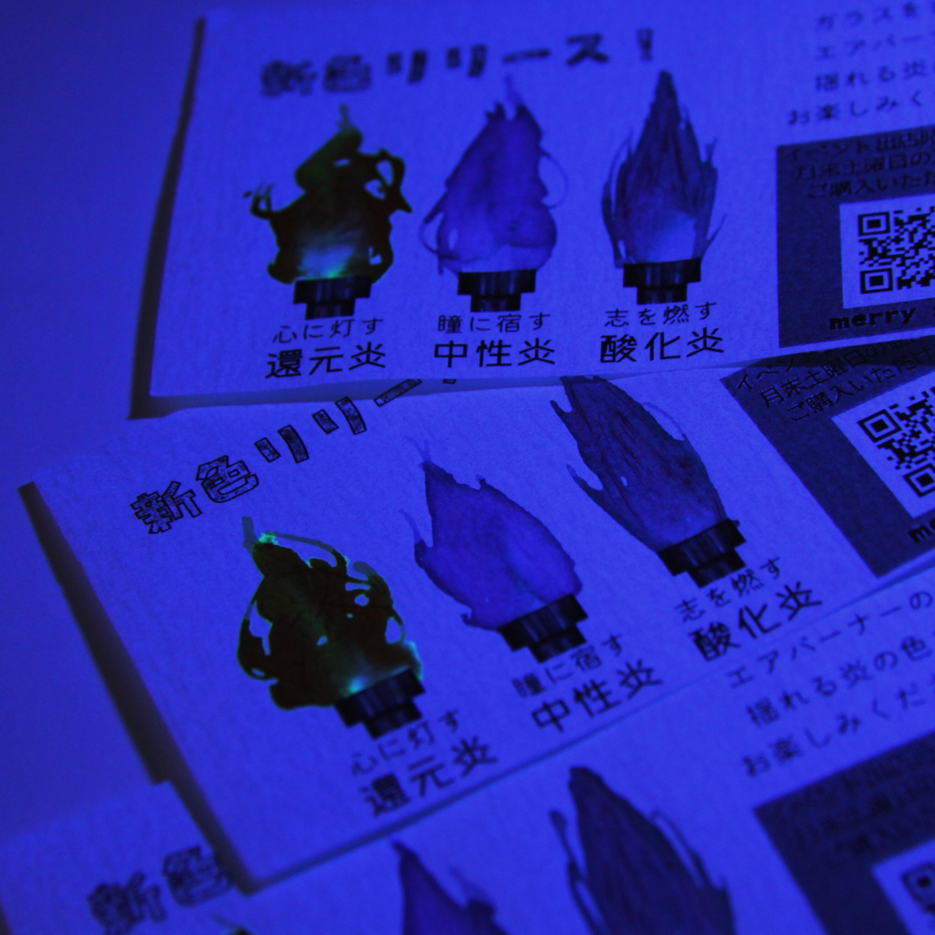 ガラスをとかすエアバーナーの、揺れる炎の色をモチーフに、インクを作っていただきました。